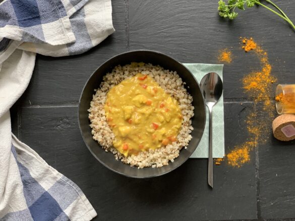 Lækker og velsmagende ret, der er hurtig at lave, og som hele familien kan spise. Baseret på en væde fra kokosmælk og piskefløde, hvilket gør den tilpas fed – og kokosmælk og karry går godt sammen. Laves i opskriften med blomkålsris.